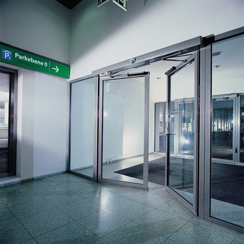 Portas automáticas em vidro, de abertura lateral, próprias para vãos de passagem intensiva. Ideais para hotéis, superfícies comerciais e de serviço público, entre outros.